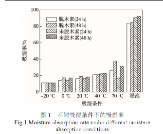 不同吸濕條件下的吸濕率見圖 1。由圖 1 可知, 隨著溫度升高,對應(yīng)的飽和濕度增加,材料吸水率增 加。根據(jù)圖 1 結(jié)果,設(shè)定脫木素材料的含水率為 0, 5%,10%,20%,40%,60%,80%和 84%,共 8 個 梯度;設(shè)定未脫木素材料的含水率為 0,5%,10%,20%,40%,60%,80%和 90%,共 8 個梯度。
