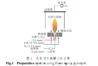 納米催化劑在商用實驗室尺度的火焰噴霧熱解 合成器(NPS10,Tethis)上進(jìn)行制備.不同載體的 CuO 納米催化劑按照以下工藝流程進(jìn)行.一定量的 三水硝酸銅(分析純,國藥集團(tuán)化學(xué)試劑)作為銅源, 溶解于無水乙醇(分析純,國藥集團(tuán)化學(xué)試劑)中.然 后,將一定量的載體前驅(qū)體,加入到硝酸銅的乙醇溶 液中.不同載體 TiO2、ZrO2 及 SiO2 所對應(yīng)的前驅(qū)體 分別為鈦酸正丁酯(分析純,國藥集團(tuán)化學(xué)試劑),硝 酸鋯(分析純,國藥集團(tuán)化學(xué)試劑)和正硅酸乙酯(分 析純,國藥集團(tuán)化學(xué)試劑).對混合后的前驅(qū)體進(jìn)行 攪拌,以至充分混合.其中,載體前驅(qū)體的金屬離子 物質(zhì)的量濃度控制在 0.5 mol/L. 如圖 1 所示,前軀體溶液通過注射泵以可控的流 率注入到反應(yīng)器內(nèi),經(jīng)過雙流體霧化形成噴霧,被甲 烷/氧氣預(yù)混輔助火焰點燃.其中的前驅(qū)體溶質(zhì)開 始氧化、分解,并在高溫火焰中解離為原子狀態(tài),然 后經(jīng)歷成核、碰撞凝并、燒結(jié)、冷凝等生長過程形成 金屬氧化物顆粒氣溶膠.當(dāng)氣溶膠到達(dá)溫度較 低的區(qū)域時,碰撞凝并的顆粒進(jìn)一步形成團(tuán)聚體,并 在真空泵的輔助下通過反應(yīng)器上方玻璃纖維處的過 濾器進(jìn)行收集.將附著在過濾器上的一層納米顆 粒刮取下來便獲得所制備的納米催化劑.