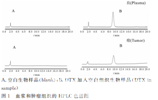 精密量取空白血漿或腫瘤組 織勻漿0.5mL,分別加入100μL不同濃度的 DTX 儲(chǔ)備液,配 制 成 有 不 同 濃 度 DTX 的 生 物 樣 品,按 “樣品的處理”進(jìn)行處理和測(cè)定,高效液相記錄色譜 圖及 DTX 的峰面積,以 DTX 的峰面積對(duì) DTX 的 濃度進(jìn)行線(xiàn)性回歸,血漿及腫瘤組織的標(biāo)準(zhǔn)曲線(xiàn)在 0.101~20.20μg·mL-1范圍內(nèi)線(xiàn)性關(guān)系良好。